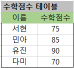 test1 <- data.frame(name=c('서현','민아','유진','다미'), math = c(75, 85,90,70),stringsAsFactors=FALSE)