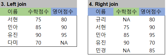 left join과 반대로 right join 은 영어점수 테이블(오른쪽 테이블)에 있는 데이터를 반환합니다. 규리와 민경이는 수학점수 테이블에 존재하지 않으므로 결측값(NA)를 반환했습니다. dplyr패키지에서 right_join 함수를 사용합니다.