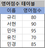test2 <- data.frame(name = c('규리','서현','민아','유진','민경'),english = c(80,90,95,70,85),stringsAsFactors=FALSE)