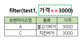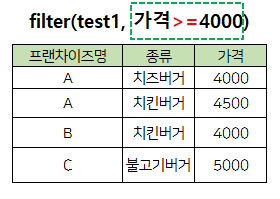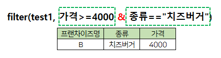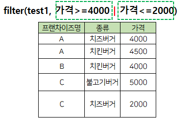 간단하게 표현하면 filter(test1, 조건식1&조건식2) 입니다. 여기서 조건식2에 프랜차이즈명이 A 또는 B 둘 중에 하나만 만족해도 되는 | 연산자를 사용합니다. 따라서 위와 같이 표현할 수 있습니다.