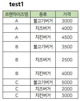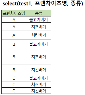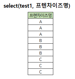 프렌차이즈명과 종류 항목만 선택하고 싶을 때 다음과 같이 쓸 수 있습니다.
