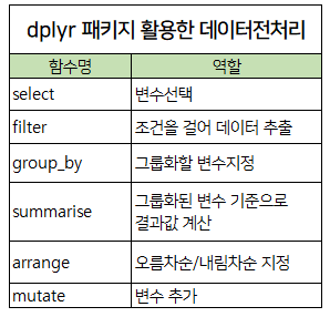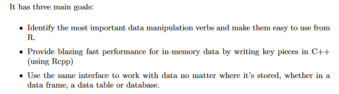 dplyr 패키지는 데이터전처리에 유용한 함수들이 많습니다. 대표적으로 쓰이는 함수는 select, filter, group_by, summarise, arrange 와 같은 함수들이 있습니다. dplyr에 쓰이는 함수들은 이름만 보아도 그 쓰임새를 추측할 수 있습니다. dplyr 패키지의 R문서에는 다음과 같은 목표로 제작되었다고 합니다.