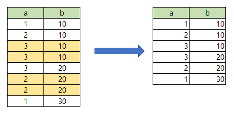 ▼ 왼쪽의 테이블에는 a=3, b=10 인 행이 두 개 존재합니다. a=2, b=20 인 행도 두 개가 있습니다. 이때 중복된 데이터를 하나의 행으로 반환할 수 있도록 오른쪽 테이블과 같이 만들어보겠습니다.