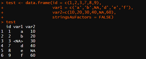 다음과 같이 var1 과 var2 에 각각 결측값이 있는 데이터프레임을 생성합니다.