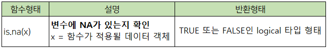 결측치가 포함되어 있다면 결과값이 TRUE 이고 그 반대는 FALSE를 반환합니다.