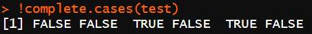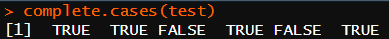 test라는 객체에 complete.cases 함수를 적용하면 해당 행에 결측치가 없으면 TRUE, 있으면 FALSE를 반환합니다.