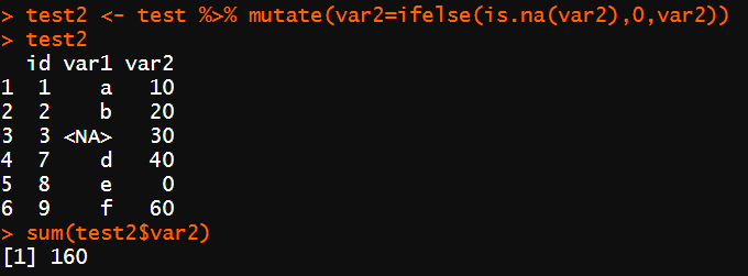 여기서는 var2의 결측치를 0으로 대체해봅시다. 아래 코드는 var2가 결측치를 포함하고 있으면 0, 그렇지 않으면 원래 숫자 그대로 나오도록 반환합니다. 수행결과를 test2라는 이름으로 저장하고 sum함수를 써보면 위와 동일한 결과를 얻을 수 있습니다. NA가 0으로 대체되었기 때문에 당연히 sum함수 안에 na.rm=TRUE 인자를 넣을 필요가 없습니다.
