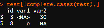 위의 조건을 바탕으로 데이터프레임에 접근하면 NA를 포함한 행이 반환됩니다.