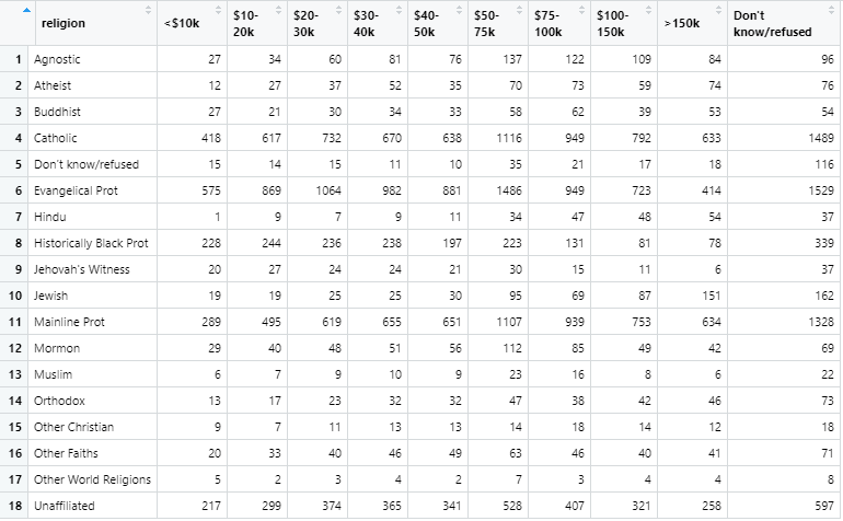 tidyr의 기본 내장 데이터인 relig_income에는 특정 종교가 있는 사람들의 연간 수입에 대한 빈도 수 정보가 있습니다.