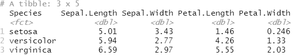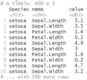 | long_iris <- iris %>% pivot_longer(cols=-Species) long_iris ![]() long_iris %>% pivot_wider(names_from=name, values_from = value, values_fn=mean) ![]()