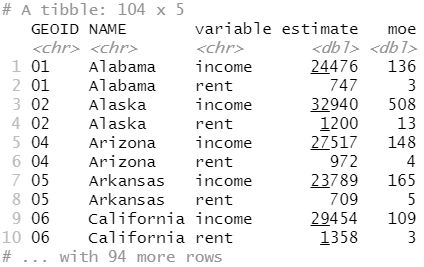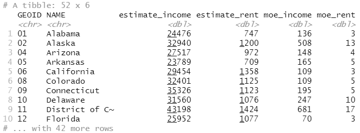 tidyr의 us_rent_income은 값이 estiamte열과 moe열이 있습니다.