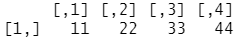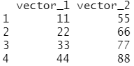 | vector_1 <- c(11, 22, 33, 44) vector_2 <- c(55, 66, 77, 88) test_data <- data.frame(vector_1, vector_2) test_data ![]() # 벡터를 전치하면 1행 4열의 행렬(matrix)이 생성 ![]()