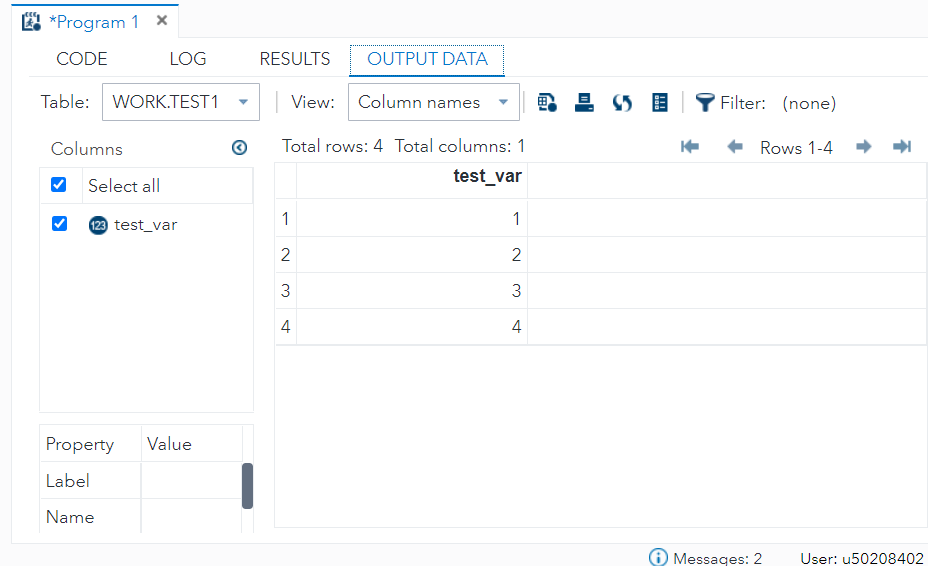 | DATA work.test1; INPUT test_var; CARDS; 1 2 3 4 ; RUN; |