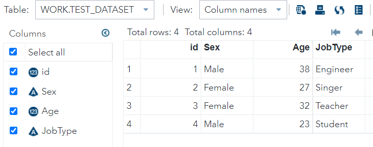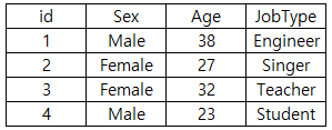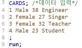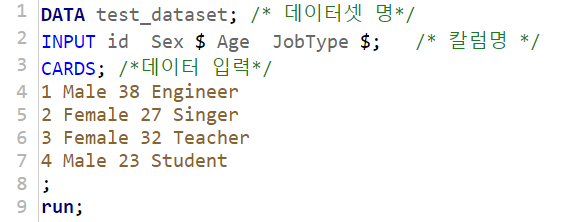 | DATA test_dataset; /* 데이터셋 명*/ INPUT id Sex $ Age JobType $; /* 칼럼명 */ CARDS; /*데이터 입력*/ 1 Male 38 Engineer 2 Female 27 Singer 3 Female 32 Teacher 4 Male 23 Student ; run; |