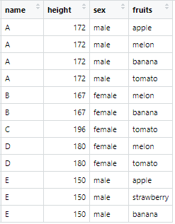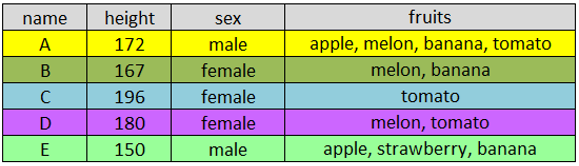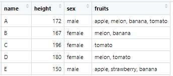 | df3 <- data.frame( name = c("A", "B", "C", "D", "E"), height = c(172, 167, 196, 180, 150), sex = c("male", "female", "female", "female", "male"), fruits = c("apple/)(*&^%$#@!, melon, banana** tomato", "melon/ banana", "tomato", "melon& tomato", "apple,^&%$ strawberry, banana")) print(df3) ![]() |