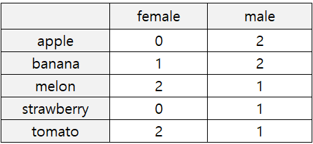 Q) 만약 성별에 따라 어떤 과일을 좋아하는지 빈도를 구하려면?